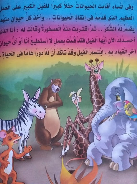 وفي المساء اقامت الحيوانات حفلا كبيرا للفيل الكبير على العمل العظيم الذي قدمه في انقاذ الحيوانات ، واخذ كل حيوان منهم يقدم له الشكر ، ثم اقتربت منه العصفورة وقالت له ، انا الذي احسدك الان ايها الفيل فقد قمت بعمل لا استطيع انا او اى حيوان اخر القيام به ، ابتسم الفيل وقد تأكد ان له دورا هاما في الحياة