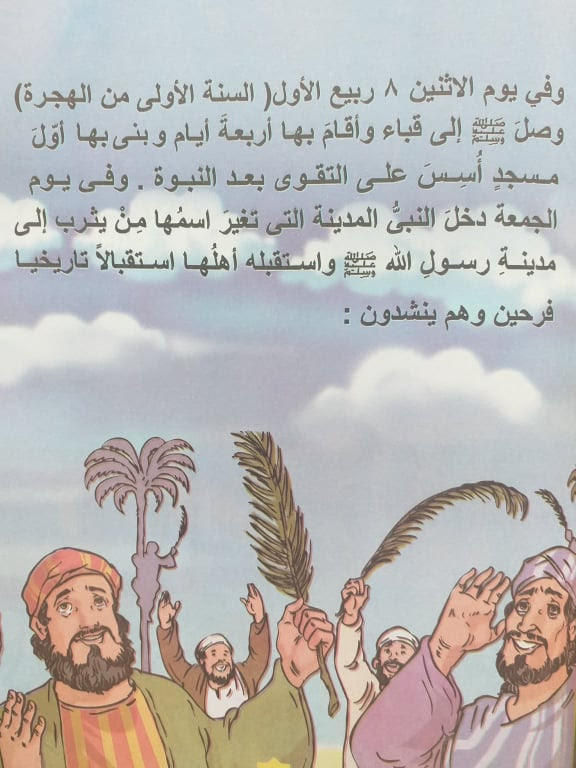 اشرق البدر علينا من ثنيات الوداع وجب الشكر علينا ما دعا لله داع واقبل الانصار يتدافعون على ناقة النبي كل منهم يريد ان يحظى باستضافته لينال الشرف العظيم فقالل لهم: خلوا سبيلها فانها مأموره حتى بركت الناقة في موضعها الذى بنى عليه المسجد النبوي واقام النبي في دار ابي ايوب الانصاري