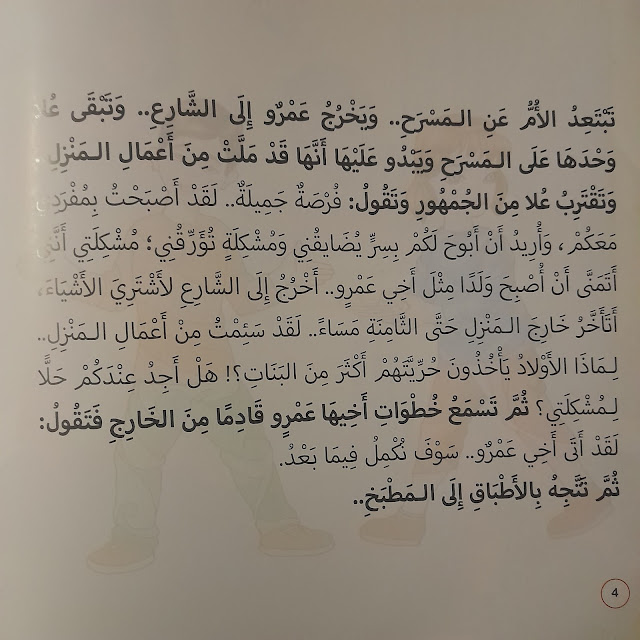 ثم تسمع خطوات اخيها عمرو قادما من الخارج فتقول لقد اتى اخى عمرو سوف نكمل فيما بعد ثم تتجه بالاطباق الى المطبخ